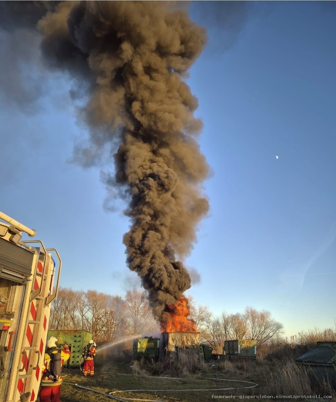 Gemeldete starke Rauchentwicklung im Bereich Stotternheim, vor Ort wurde ein Abrollbehälter gefüllt mit Dachpappe in Vollbrand festgestellt. Vor Ort waren ebenfalls die Feuerwehreinheiten aus Alperstedt und Großrudestedt.