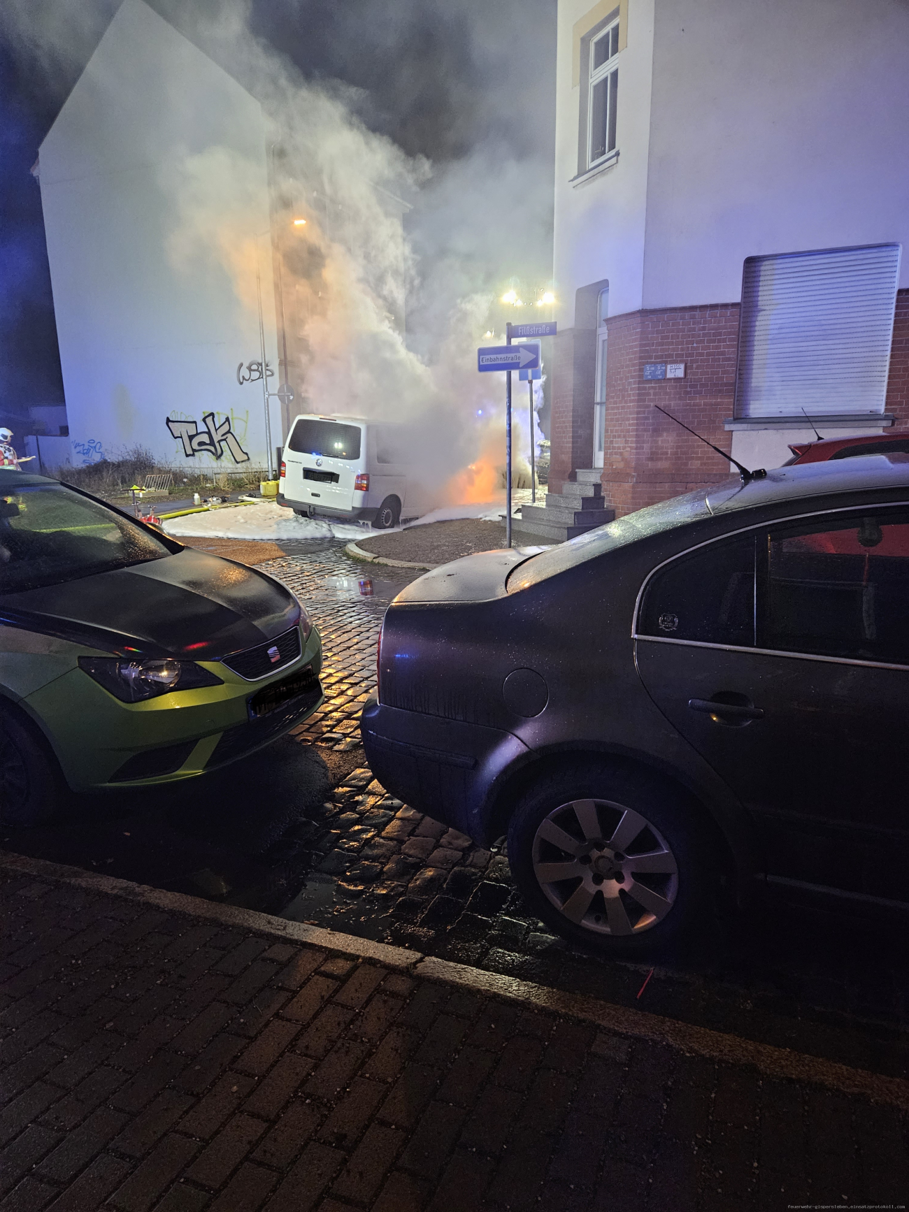 Brand von 2 PKW und 2 Transportern, Übergriff auf Mehrfamilienhäuser drohte.